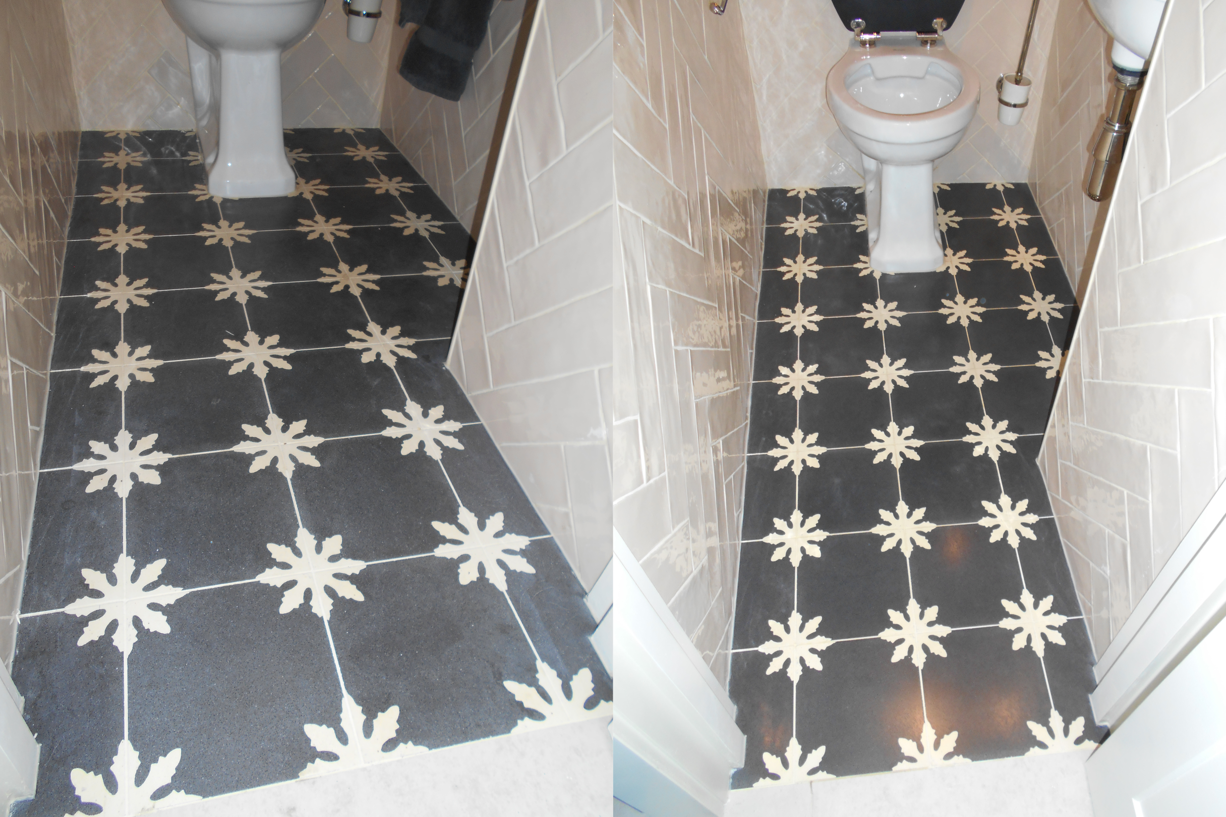 In the pics above you can see how badly damage these cement tiles where on a bathroom floor. In the after pic you can still see a few blemishes but it is much much better!