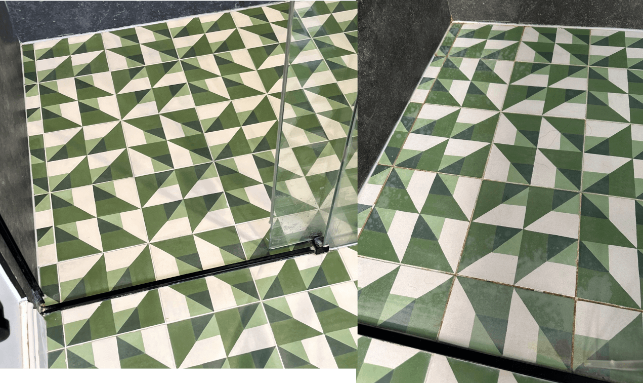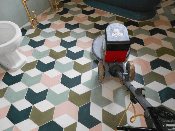 To clean these tiles we are limited to what chemicals we can use as anything too strong or acidic effects the pigments. So we are mostly left to mechanical means to remove grout residues, marks, etches and staining. This for us involves many different types of abrasive products and some of our results have been quite amazing.